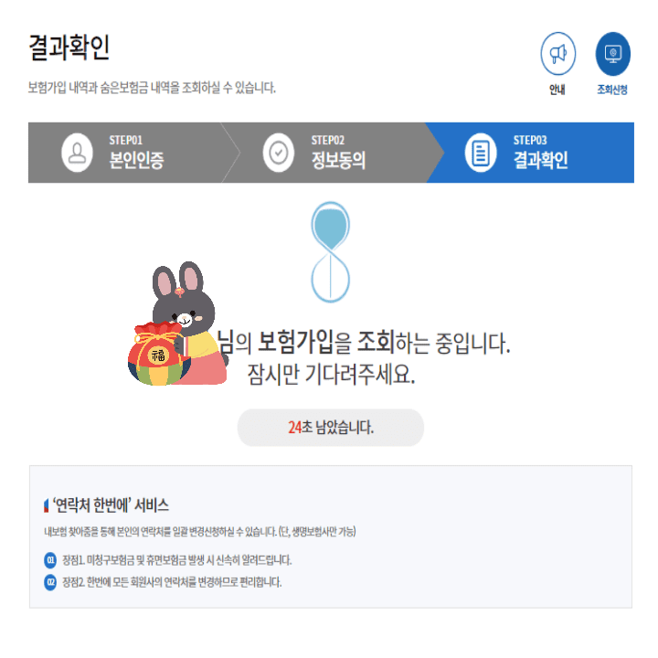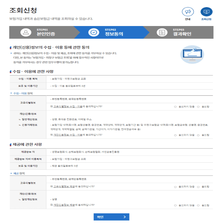 수집이용약관에 동의함 체크 후 확인을 누르면 결과확인에서 30초 정도 보험가입을 조회 중입니다 라는 메시지와 함께 잠시 후 결과를 확인할 수 있습니다.