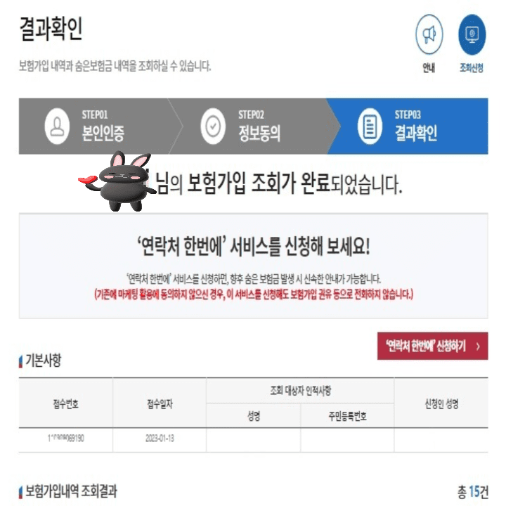 저의경우 15건의 보험가입내역 조회결과가 나왔고 한 번에 내가 가입한 보험을 조회할 수 있어서 편리하네요.. 아쉽게도 저는 중도, 만기, 휴면 보험금이 존재하지 않아서 받을 금액이 없네요.. 이 글을 보시는 분들은 조회해서 결과확인 후 못 찾아간 보험금 받으시길 바랍니다. <연락처 한 번에 신청하기> 버튼이 있어서 클릭해서 신청하면 중도나 만기 또는 휴면 보험금 발생 시 빠르게 안내받을 수 있습니다. 단 신청할 때 마케팅동의에 동의하지 않음을 체크하셔야 불필요한 보험가입전화를 받지 않을 수 있습니다.