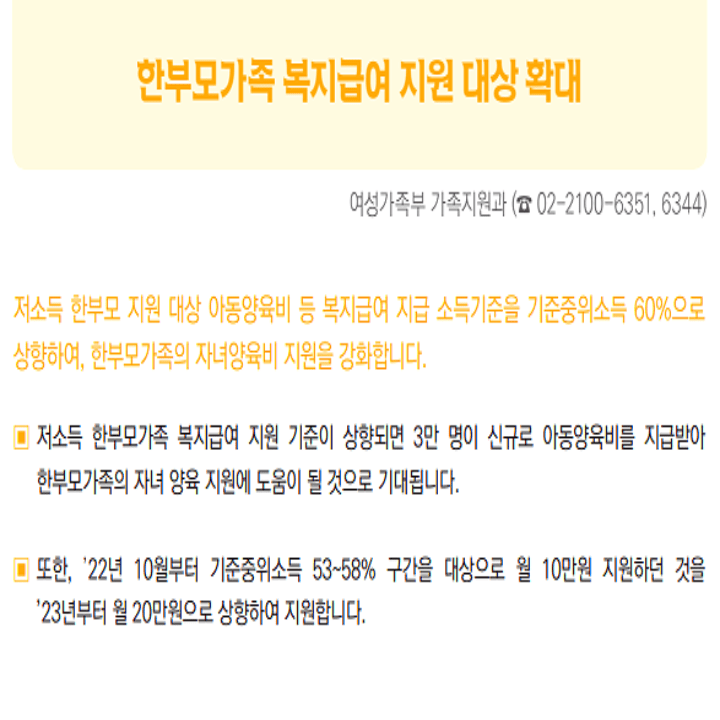 저소득 한부모 가정의 복지급여 지원기준을 상향 조정해 한부모 가정의 양육비 지원 대상을 3만 명으로 추가 확대하기로 했. 현재 기준 중위소득이 58% 이하였는데 60% 이하로 바뀌었고, 월 지원액도 10만 원에서 20만 원으로 확대됩니다.