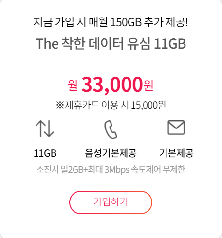 통화무제한 + 데이터플러스 150기가와 유심 11기가를 제공하며 161기가 까지 다소 진하면 매일 2기가를 추가로 제공합니다. 이 역시 다시 용하면 3 Mbps의 속도로 무제한 이용이 가능합니다.
