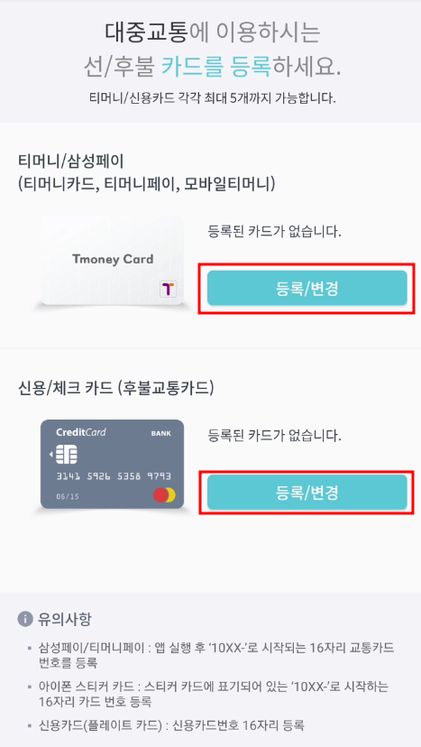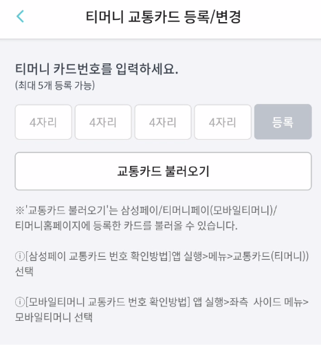 6. 교통카드 등록은 2가지 방법이 있습니다. 첫 번째는 티머니/삼성페이 교통카드 등록 방법입니다. 티머니카드, 티머니페이, 모바일티머니를 등록/변경이 가능하며, 총 5개까지 카드등록이 가능합니다.