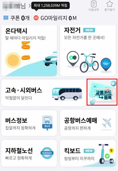4. 모바일 메인화면에서 교통카드 등록을 눌러주세요! 마일리지 적립은 최대 1,258,539M 적립가능하며 온다 택시, 자전거, 고속│시외버스, 공항버스, 버스, 지하철, 씽씽 킥보드를 이용하면 마일리지가 적립됩니다.