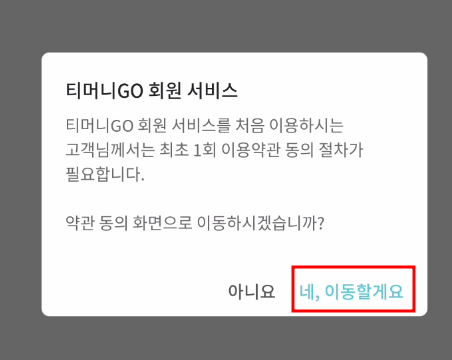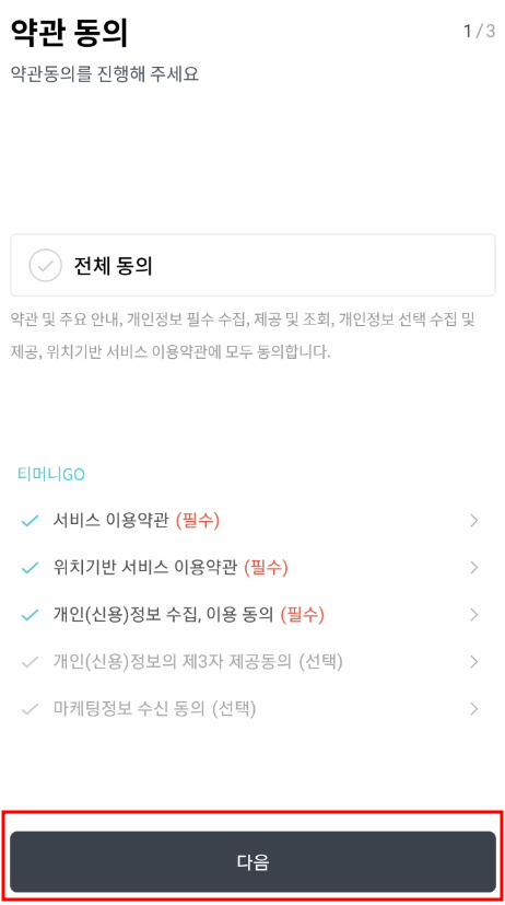 3. 티머니 GO 회원서비스를 처음이용하시게 되면 최초 1회 이용약관 동의절차가 필요합니다. 필수약관에 동의하시고, 다음을 눌러주세요!