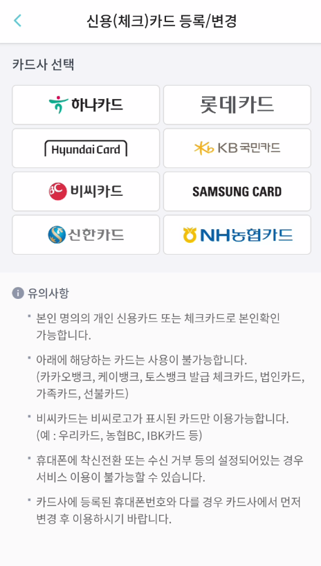 7. 교통카드 등록 두 번째 방법은 신용/체크카드 후불형 교통카드를 등록방법입니다. 하나카드, 롯데카드, 현대캐피털카드, 국민카드, 비씨카드, 삼성카드, 신한카드, 농협카드를 최대 5개까지 등록하실 수 있습니다. 우리 카드의 경우 비씨카드로 등록하시면 됩니다.