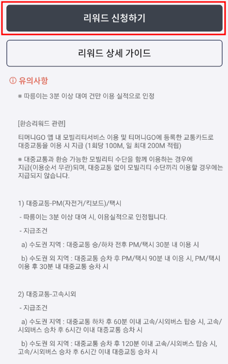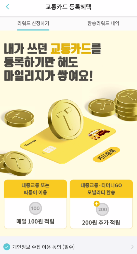 5. 교통카드 등록혜택 화면에서 리워드 신청하기에 개인정보 수집이용동의 필수항목에 체크한 뒤 리워드 신청하기를 클릭해 주세요!