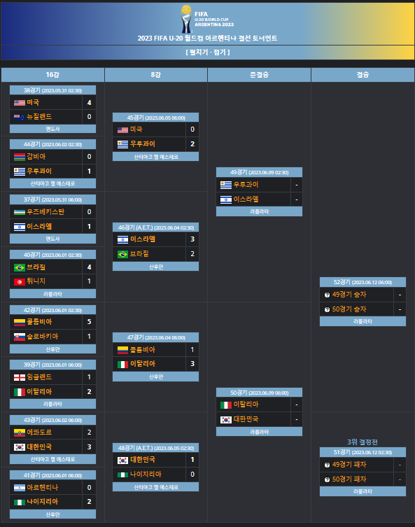 2023 FIFA U-20U 아르헨티나 결선 토너먼트는 16강, 8강, 준결승, 결승으로 나누어져 있으며 6월 9일 이탈리아와 준결승전이 펼쳐질 대한민국 국가대표팀의 준결승전 승리를 기원합니다.