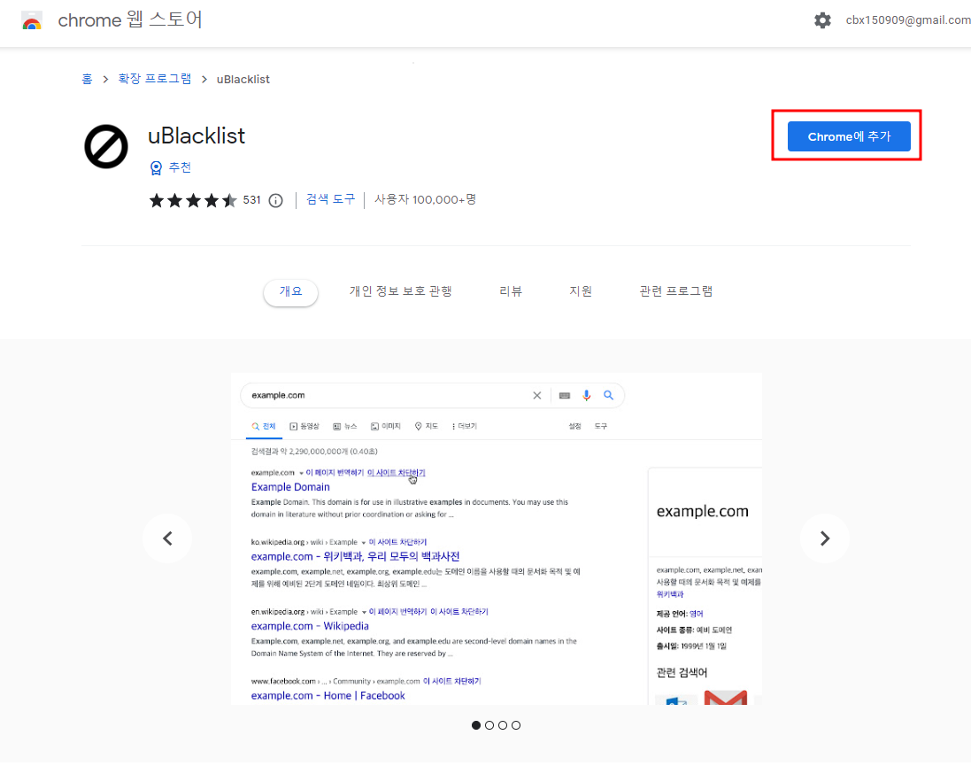 2. 크롬웹스토어 화면에서 우측 맨 위에 ublacklist 크롬에 설치하기를 클릭해서 설치해 주세요!